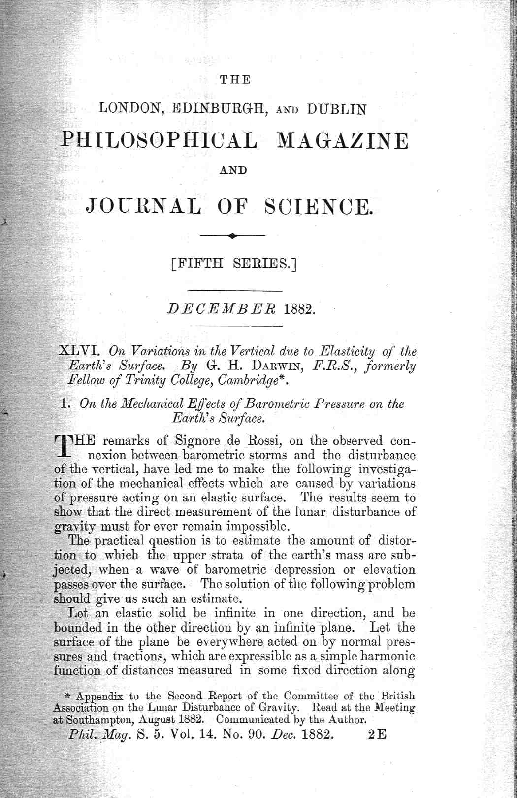 Darwin, G.H., On variations in the vertical due to elasticity of the Earth's surface, Phil. Mag., Ser. 5, vol. 14, N. 90, 409--427, 1882.